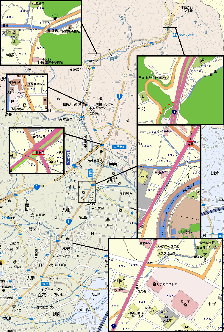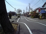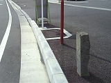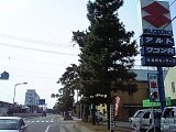 {右}岡部松並木 県道208号は少し先で県道81号と合流(重複)ししばらく歩いていくと歩道上にある。松は大小合わせて50本ほどあるが大きいのは数本しかない。並木が始まる場所と終わる場所に藤枝ライオンズクラブから黒松13本が贈られたという平成8年設置の木杭がある。松並木を過ぎて少し先の右側歩道の植え込みにはキノコ型をした常夜燈もある。横には「これより東海道 岡部宿」と刻まれた平成11年設置の石碑もあり江戸側からは後ろ向きに設置されている。その先の内谷新田交差点を渡ると国道1号藤枝バイパスの高架をくぐる。 |