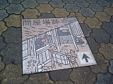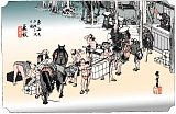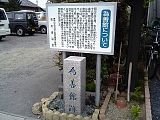 {左}下伝馬問屋場跡 大黒天向かいの民家前の歩道にイラストプレートが埋め込まれている。藤枝宿には上伝馬問屋場と下伝馬問屋場があり当初は上伝馬にしかなかったが慶長12年(1607)より田中城の大手口に近いこの場所にも問屋場が置かれた。上り(京方向輸送)と下り(江戸方向輸送)で分担し下伝馬問屋場は上りのみを担当した。藤枝宿の9町のうち下伝馬問屋場の負担をしたのは左車町・下伝馬町・長楽寺町で人足11人と馬50頭は下伝馬町が負担し人足39人を残り2町で負担した。下伝馬町と長楽寺町の間の白子町は家康の朱印により伝馬負担がなかった。広重の保栄堂版東海道53次の藤枝宿は問屋場の様子を描いているが上伝馬問屋場の方とされる。 |