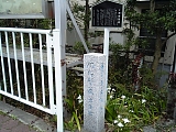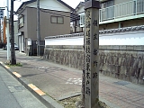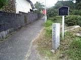 {左}田中藩領傍示石蹟 信号を1つ過ぎ松を1本過ぎた少し先の民家前に平成6年建立の青字石柱と平成10年設置の説明板がある。「従是西田中領」と刻まれた一丈(3m)の石柱があった場所で細島村の西端にもこれと対になる傍示石「従是東田中領」があったとされるが特定はされていない。上青島村は横須賀藩領の下青島村と複雑に接しており上青島村の一部は旗本日向銕太郎の所領にもなっていた。この先は松並木が少しずつ続き歩道に松があるため歩道がなくなる部分もある。 |