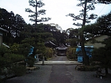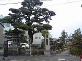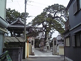 {左・寄}圓妙山 大慶寺 [日蓮宗] 藤枝4-2-7 アーケード付きの上伝馬商店街に入り少し先のおきせ金つば本舗の先に看板があり左折正面。当地に住む夫婦の茶店に仁治元年(1240)比叡山に行く途中の日蓮が立寄り建長5年(1253)帰郷時も訪れ夫婦に道圓・妙圓の法号と題目本尊、毘沙門天王を与え松一本を手植えし開山した。夫婦は堂を建立し開基となった。本尊は一塔両尊(釈迦牟尼如来・多宝如来)。境内の中央にある松は久遠の松と命名され県天然記念物。樹齢約750年高さ25m根廻7m目通4.5m。城郭御殿建築の庫裡は天明6年(1786)に失脚した田沼意次の相良城御殿を移築。現本堂は昭和2年(1927)築。