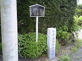 {左}田中藩領傍示石蹟 西友南新屋店(南新屋408-4)を過ぎ県道356号を横断すると少しずつ松並木が現われる。少し先の松が3本並んでいる向かいに平成6年建立の青字石柱と平成10年設置の説明板がある。藤枝宿より前の法の橋にあった「従是西田中領」と対になる高さ一丈(3m)の石柱傍示石「従是東田中領」があった場所。享保15年(1730)から幕末までの田中藩主である本多氏の5代正意が領内の藪崎彦八郎に命じ文字を書かせ長楽寺町の石材屋に彫らせた。この付近の瀬戸新屋村は田中藩領と掛川藩領が入り組んでおり藩境に境界を示す榜示石がいくつか建てられていた。この先の上青島にも田中藩領傍示石があった。 |