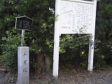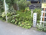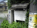 {左}千貫堤蹟 下青島1006-1 染飯茶屋蹟の向かいの道少し奥に平成6年建立の青字石柱と平成10年設置の説明板、図面入りの説明板がある。堤は無縁寺の山裾から南の藤五郎山を挟み本宮山の正泉寺(青葉町3-14-10)まで山と山をつないで土手を作り大井川の洪水を防いだというもので寛永12年(1635)〜寛永19年(1642)の田中藩主だった水野忠善が築いた。長さ360m高さ3.6m幅2.9mあり一千貫の労銀を投じたため千貫堤と呼ばれた。昭和40年代の土地開発によって藤五郎山もろとも堤は取り除かれたがここから南の約40mが石野家生垣としてわずかに残っている。昭和31年市文化財に指定。 |