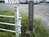 {左}上青島一里塚跡(51) 橋を渡ると上青島の松並木が続く。松並木の途中に夢舞台道標藤枝市 上青島の一里塚がありその左の広い駐車場入口に昭和61年建立の石柱「東海道(上青島)一里塚趾」がある。側面には「→南約十米道路東円形にて約百二十平米」「一里山土地改良完成記念」とある。隣には古い木杭もある。塚の上には榎ではなく桑の木が植えられていた。この辺りを一里山と呼び少し先にあるバス停の名前にもなっている。弥次さん喜多さんのイラストがあるそば食事処さんし(上青島666-1)を過ぎると一里山交差点で東海道は国道1号に合流する。 |
