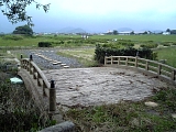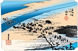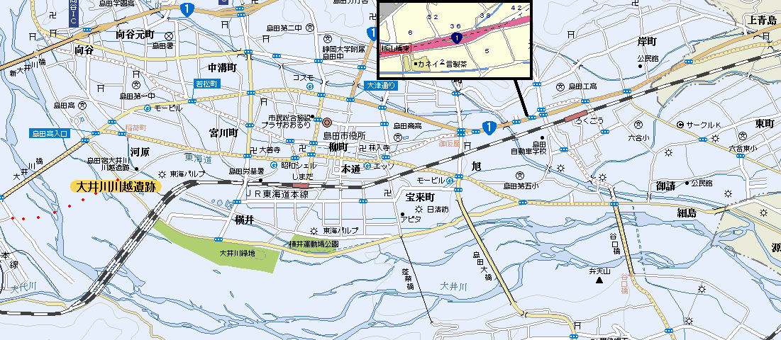 大井川 川越広場 博物館の先は大井川の河川敷に出る。河川敷にはミニチュア東海道として日本橋から三条大橋までをミニサイズで辿れるレイアウトで砂利やブロック、低木、橋などで作られた広場がある。以前は東海道53次の全宿場の広重の絵のパネルや宿場にちなんだ句・歌碑等が相当する位置に設置されていたが現在は川に近いところに作られた大井川マラソンコース「リバティ」の沿道に移設されている。復元された蓮台もいくつか草むらの中に設置してある。公園の左にはグラウンド・ゴルフ場などもある。大井川は南アルプス南部の間ノ岳を水源とし延長168km流域面積1200平方kmで駿河湾に注ぐ。現在、大井川を渡るには土手上の道を川上に向って進み県道381号線(旧国道1号)の大井川橋を渡って迂回する。 |