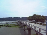 {左・寄}蓬莱橋 島田信用金庫七丁目支店前に再び夢舞台道標島田市 島田宿があり隣の中村菓子舗との間を左折しJR線路を渡り直進するとある。旧幕臣達が牧之原に茶畑を開墾し対岸へ往来するようになり明治12年(1879)大井川に架けられた木橋。名は静岡藩主徳川亀千代(家達)が明治3年牧之原を訪れ言った「ここは宝の山だ」に由来する。全長897.422m幅2.7m木板数3700枚。昭和40年架替えし橋脚がコンクリートになった。平成9年世界一長い木造歩道橋としてギネスに認定。8:30-17:00。歩行者100円で全国唯一の木造有料橋。橋手前には昭和49建立理論物理学者石原純の即吟詩、平成6年建立作家吉田絃二郎の句碑、大井川の変遷の説明板、ギネス認定記念碑、平成4年大井川改修110年記念碑がある。 |