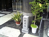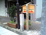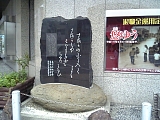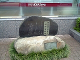 {右}芭蕉句碑 本通3-2-1 次の交差点である本通り2丁目交差点の島田信用金庫本店前にも昭和50年建立の句碑がある。碑面には「するがの国に入て はせを するがぢや はなたち花も ちゃのにほひ」とある。この句は芭蕉最後の旅となる江戸から伊賀・奈良・大阪への旅の途中の元禄7年(1694)5月塚本如舟邸に4日間滞在した際に詠んだ句で句集「芭蕉七部集」の「炭俵」上巻夏の部に収録され「島田よりの便に」という後書がある。他にもこの滞在時には「さみだれの 雲吹きおとせ 大井川」「ちさはまだ 青葉ながらに なすび汁」「たはみては 雪まつ竹の けしきかな」なども詠んだ。碑文は塚本家に残されていた芭蕉の真跡から模刻したもの。同じ句の碑は清水寺と静岡茶の発祥地である静岡市葵区足久保にもある。 |