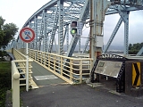 {右・寄}大井川橋 橋に行く途中右に一里塚風に盛られた小山があり夢舞台道標島田市 島田宿と昭和5年(1930)建立宮内大臣一木喜徳書「永御景迹」と刻まれた大きな石碑がある。橋は明治9年(1876)川の一部だけに全長234m幅2.7mの有料木橋、明治16年(1883)全体を渡る1.3kmの木橋が架けられたが明治29年(1896)の洪水で流失、その後は船渡しとなり昭和3年(1928)に現在の橋である鋼製プラットトラス橋が竣工した。歩行者には左側に車道と完全に区画された昭和42年竣工の歩道(幅1.5m)があり入口右には平成15年設置のトラスの上部をモチーフにした説明碑もある。歩道架設で親柱は撤去され金谷高校(金谷河原35東)の正門として移設された。橋は全長1026.4m幅8.3mで渡るのには約15分かかる。 |