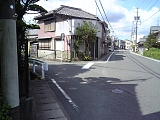 {左}七曲入口 歩道が整備された道を真っ直ぐ進んで行くと道が徐々に右に曲がるのが見え歩道がなくなる兼子酒店の先右に新町東伝寺入口バス停と「東海道七曲」の標識があり東海道は県道37号線から分岐し斜め左に入る。掛川宿は開設当初は表町として木町(喜町)・仁藤町・連雀町・中町・西町、裏町として塩町・肴町・紺屋町・研屋町、横町として瓦町の10町だったが元和6年(1620)新町が表町に加わりここにあった掘に架かる橋を渡って門を通り掛川宿新町に入るようになった。城下町であった掛川の東海道は敵の進入を防ぐために角を何度か曲がるように作られておりここから東番所までを新町七曲と呼んだ。宿場町は後に文化3年(1806)下俣町と十九首町も表町に加わり計13町となった。 |