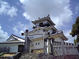 {右・寄}掛川城 天守閣 掛川1138-24 連雀西交差点を右折し緑橋で逆川を渡るとある。左に四脚門、くぐって右に縮尺150分の1の有田磁器製の城主要部模型、その先左に太鼓櫓、右に天守閣、御殿がある。掛川城は掛川古城を築城した朝比奈泰煕の子の泰能が永正10年(1513)頃築城した城が起こりで永禄12年(1569)家康が奪取し石川家成、康通を城代とした。天正18年(1590)家康関東移封で山内一豊が城主となり拡張整備し慶長元年(1596)天守閣を築いた。現在の天守閣は平成6年高知城を参考に復元。3層4階の本格的木造で最上階は海抜約56mで屋根の鯱は重量200kg。天守閣内部には鯱の原寸大複製や江戸時代の鎧兜などを展示。天守閣入口前には霧吹き井戸もある。9時-17時(11月〜2月-16:30)300円(御殿と共通)無休。 |