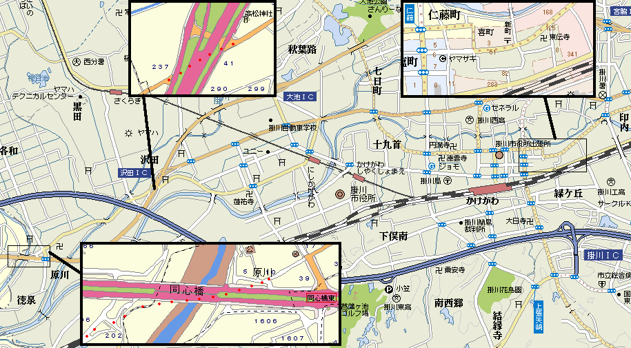 分断された東海道 しばらく行くと国道1号バイパスの高架前の沢田IC南交差点に出る。交差点手前右には高松神社と細沢公民館。旧東海道は本来ならば高架の向こうの道にまっすぐ続いているはずが道は曲げられているため交差点を渡り高架をくぐってから突き当りの沢田IC北交差点を左折して少し先で斜め右に分岐し県道253号線に入る。この道が旧東海道の続きとなる。県道253号線を進み今度は東名高速の高架をくぐると左に松がありその先右にも松が4本ある。さらに進むと垂木川に出る。県道には昭和48年竣工の善光寺橋が架かっているが歩道がないため左に昭和55年竣工の善光寺歩道橋がある。 |