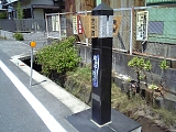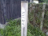 {右}中ノ町村・和田村境杭 少し先の金原明善生家手前には「中ノ町村・和田村境」木杭がある。昭和29年まではここが村境であり明治29年(1896)までは豊田郡と長上郡の郡境でもあった。現在は浜松市東区中野町と安間町の境となっている。明治22年(1889)町村制施行で橋羽村、安間村など11村が合併して出来た長上郡橋田村は明治24年(1891)和田村となり明治29年浜名郡に編入され昭和29年に中ノ町村と共に浜松市に編入された。 |