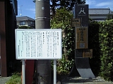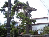 {左・寄}法橋の松 しばらく行くと十字路があり左折して行くと天竜川駅。駅に向かう途中右の和菓子清好堂(天龍川町290)先の細道を右折すると左にある。妙恩寺を開基した金原法橋の祖先は日蓮の母方の伯父ともされる下総国金原大宮別当職大野政清でその子孫の金原氏は鎌倉時代に蒲御厨地頭遠藤氏の跡を継ぐ為に遠州にやってきた。法橋はこの地に公文屋敷と呼ばれる屋敷を構えておりその前庭にあったと言われるのがこの松で昭和27年県指定天然記念物。樹齢700年幹周り5m枝張り18m高さ14mで敷地には昭和12年(1937)と昭和14年の石碑、説明板、小さな祠もある。妙恩寺創建より前に妙恩寺開山の日像の妹である妙恩法尼が京都に居る日像を訪ねる途中にこの屋敷を訪れ庵を建てたとも言う。 |