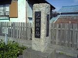 {右}(上之渡船場) 池田橋跡 池田の渡し歴史風景館前を左折し河原に向かうとすぐ右に昭和49年建立の「池田橋の跡」石碑がある。渡船業に影響があるため明治7年(1874)の天竜川橋架橋を反対していた池田村も時代の流れに逆らえず鈴木浦八、熊岡安平、村松七十郎、田中新十郎らの協力で株式会社組織の昇龍社を創設し明治16年旧渡船ルートに池田橋を架けた。長さ425間(765m)幅9尺(2.7m)の有料木橋で橋銭は大人3銭小人2銭だった。さらに同年上流の豊田郡匂坂(現:かささぎ大橋の下流)にも木橋の豊田橋が架けられた。明治22年の洪水で両橋とも損害を受けたが池田橋は復旧され昭和8年(1933)国道(当時)に天竜川橋が竣工するまで利用された。碑の向かいには家康の朱印状を模した高札風説明板もある。 |