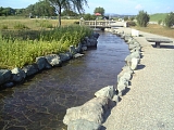 {右}(上之渡船場) 池田の渡し公園 河川敷に出るとある。渡船場を再現したという公園。天竜川や舟渡しに関する複数の説明碑も設置されている。公園を流れる小さな川は天竜川をイメージして造られた。乗って回り始めたら自然には永久に止まることがないという独楽の遊具もある。現代の天竜川は渡し船がないため上之渡船跡から1.6kmほど下流にある国道1号にかかる新天竜川橋で渡る。下流に向かうと河川敷にはグラウンド4面、交通公園、ローラースケート場がある。新天竜川橋のすぐ南には県道261号にかかる天竜川橋もあり両橋の間の河川敷には天竜川治水祈念公園がある。天竜川は諏訪湖を水源とする全長213km(国内9位)流域面積5090平方km(国内12位)の川で古くは「暴れ天竜」と呼ばれ多くの水害を起こした。 |