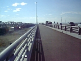 {左・寄}新天竜川橋 昭和8年(1933)当時の国道1号(現:県道261号線)に長さ919.4m幅7.3mの鋼トラス橋(鉄橋)である天竜川橋が架けられ昭和40年に新しい国道1号が通ると天竜川橋のすぐ上流に新天竜川橋(長さ912m幅14.5m)が架けられた。昭和48年に2車線から4車線に拡幅(幅15.6m)されたが歩道がなく交通量も増大したため平成18年に天竜川橋との間に幅4mの歩道を含む下り専用4車線の新新天竜川橋(幅19.75m)が架けられた。従来の新天竜川橋は4車線とも上り専用に変わり2つの橋で合計8車線となった。天竜川を渡ると浜松市東区中野町に入る。中野町は東海道の真ん中の意味で付いた地名で東海道中膝栗毛にも「江戸へも六十里、京へも六十里にてふりわけの所なれば中の町といへるよし」とある。 |