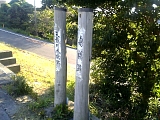 {右}舟橋跡・天竜川木橋跡 すぐ先に2本の木杭がある。明治元年(1868)に臨時の舟橋を架けた浅野茂平が数年後に自費で架橋し通行料を徴収するという計画書を萱場村の鈴木謙一郎と共に県に提出し許可され明治7年(1874)中洲間を渡る4つの木橋と亀甲形空船を横に並べ板を敷き櫓で固定した本流の舟橋から成る天竜川橋が架けられた。橋部分が計315間(570m)で中州の道路部の333間(600m)と合わせ全長648間(1170m)を有料通行区間とし通行料は大人9厘人力車2銭1厘牛馬3銭だった。しかし明治9年洪水で被災し明治11年に金原明善が木橋の天竜橋を架けた。木杭は浜松市の史跡の印となっておりこの後も同様の木杭が多く設置されている。 |
