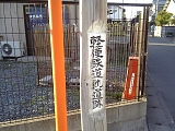 {右}安間一里塚(64) しばらく行くと右後ろから道が合流してくる手前の三角地帯のフェンス越しに木杭がある。隣には「旧東海道」木杭もある。塚は現存しないが両側に榎が植えられていた。手前の細道を北上し県道314号線を経て県道261号線を市野宿へ向かう道は姫街道で見付宿から池田に出て船で天竜川を渡り市野へ向かう姫街道(池田道)と途中の下石田町で合流する。安間一里塚は東海道と姫街道の共用の一里塚で姫街道には同じく東海道と共用の御油一里塚までの間に12の一里塚が築かれていた。この分岐には以前は鳳来山東照宮も隣接する鳳来寺[真言宗五智教団](愛知県新城市門谷鳳来寺1)道標があったが現在は安間橋を渡って右の天竜公民館(薬新町99)駐車場の隅に移されている。 |