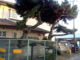 {左}倒れかけた松(松並木の名残) 国道1号をくぐると100mほど薬師町の松並木があり一旦なくなった少し先には倒れかけた松が1本ある。支柱で支えられ金網のフェンスも設置されている。松並木は松喰虫の被害で現在では薬師町に約20本、手前の安間橋を渡った薬新町に1本、この先の薬師バス停を過ぎた天龍川町に5、6本(50mほど)、その先の和田町に数本残っているのみとなっている。 |