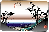 潮見坂(汐見坂) 中丁公会堂から少し進んで右折するのが東海道。分岐点に大正13年(1924)建立の道標「左新道 右旧道」と夢舞台道標湖西市 白須賀宿 潮見坂下がある。ここから500mほどの潮見坂を登っていく。京から江戸への旅では初めて太平洋の大海原や富士山が見える場所で東海道有数の景勝地だった。元禄4年(1691)オランダ商館長に随行して江戸参府したドイツ人医師ケンプェルの江戸参府旅行日記には「ここより初めて驚くにたえたる高嶺にして世界の最も美しい山たる富士山を仰ぎ得たり」東海道中膝栗毛には「北は山つづきにして南に蒼海漫々と見へ絶景まことにいふばかりなし」とある。広重も保栄堂版をはじめ白須賀宿の絵として潮見坂を描き大正期には今村紫紅、昭和期には山下清も描いている。 |