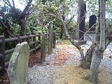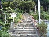 {右}紅葉寺跡 松並木が始まって少し先左に夢舞台道標新居町 紅葉寺跡がありその向かいを右折すると古い石段の左に古い石柱と平成16年設置の木製立札説明板がある。建久元年(1190)高野山より毘沙門天立像を勧請して建立された寺が起こり。同年上洛途中に橋本宿に宿泊した頼朝の寵愛を受けた長者の娘が後に出家し妙相と名乗り建立したとも言う。室町幕府6代将軍足利義教が永享4年(1432)富士下向の際にここで紅葉を鑑賞したとされその頃から紅葉寺が通称となった。荒廃後に本覚という僧が曹洞宗の紅葉山本学寺として再建したが再び荒廃し廃寺となった。現在は建物はなくベンチが置かれ石段を登った右に石仏3体の祠や明治31年(1898)歌碑、雌株の大銀杏、左奥には古い石塔、墓石などがある。 |