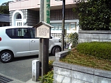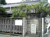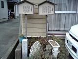 {右}夏目甕麿(みかまろ)邸址 加納諸平(もろひら)生誕地 十字路を渡ったブロック塀に昭和40年の石碑と昭和47年の説明板。家業の酒造を営む傍ら内山真龍に国学を学び寛政10年(1798)26才で本居宣長に入門した甕麿は通称嘉右衛門、萩園と号し宣長没後は子の本居春庭に学び42歳で隠居して学業・執筆に専念、文政4年(1822)49歳の時に関西へ旅に出たが翌年摂津(兵庫県伊丹市)の昆陽池で酔って水死した。賀茂真淵の「万葉集遠江歌考」等を出版し著書には「古野の若菜家集」等がある。甕麿の長男の諸平は柿園と号し紀州の本居大平(宣長の養子)の許で国学を学び同時に紀州藩医・加納伊竹に医学を学び18歳で加納家の養子となる。安政3年(1856)紀州藩国学所総裁となり翌年53歳で没した。「当代類題和歌選集」等の多くの著作を残した。 |