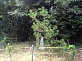 {右・寄}うないの松(うなひの松) 坂を登っていくと道が左にカーブした少し先で右から蔵法寺から通じる道が合流する。この道に入り少し先右の奥に説明板とロープで囲まれて直径120cmほどの切株がある。文明8年(1476)南遠小笠郡南村(現:菊川市小笠町)塩買坂で横地四郎兵衛の残党に襲われ没した駿河今川家6代当主今川義忠の胴を葬ったと伝わる場所。うないとはうなじの意味で潮見坂のうなじの位置であるため名が付いたと言われる。ここにあった松は昔から枝一本折ってもオコリ(多くはマラリアのこと)になると恐れられていたが昭和54年に枯れ平成元年に切株の隣に小さな2代目が植えられた。敷地には松の由来を記した昭和52年建立「うないの松あと」石碑、蔵法寺第16世嘯雲光均でもある久内和光の歌碑、小さな石塔も残る。 |