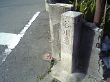 {右}谷川道道標 その先で右に分岐する道が谷川道で右に道標がある。旧谷川村は二川宿へ行く途中に見える岩山の立山や湖西連峰の麓のあたりで付近には頼朝も訪れた船形山普門寺[高野山真言宗](豊橋市雲谷町ナベ山下7)がある。道標から谷川道を挟んだ反対側には平成6年建立の「高札建場跡」石柱もある。 |