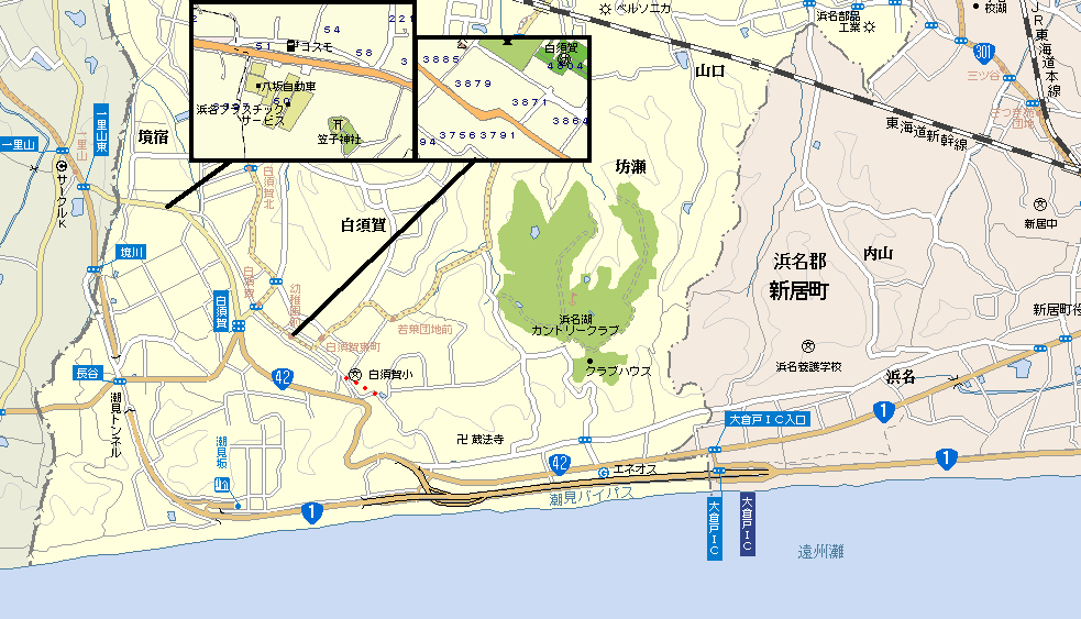 白須賀宿 本陣1脇本陣1旅籠27家数613人口2704[天保14年(1843)] 白須賀という名前は白い砂州に開けた集落という意味で海沿いの町の意。設置当初はその名の通り潮見坂下の海辺に近い元町にあったが宝永4年(1707)大地震と津波で壊滅したため翌年坂上の現在地に移転した。しかし小規模な宿場だった為に多くの大名はここを素通りして舞坂、浜松、西であれば御油、赤坂に宿泊したという。天保14年(1843)の記録で東西14町19間(1.5km)。現在も主要交通から外れているため旧宿場の雰囲気が残っている町になっており江戸時代の屋号を書いた看板が各家に掲げられている。 |