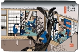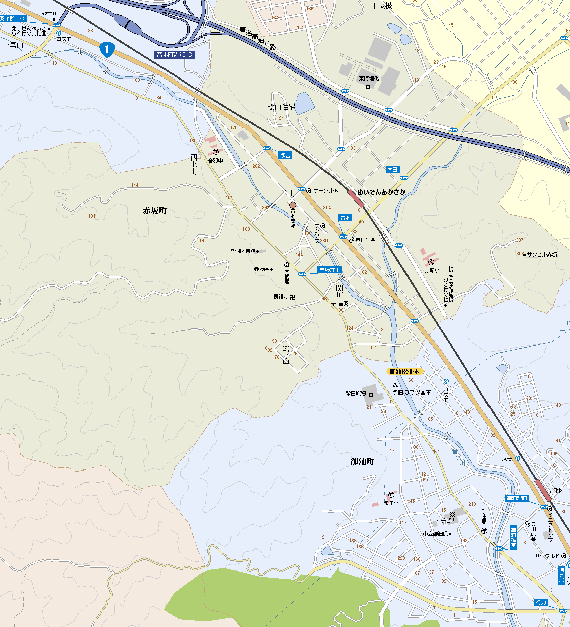 赤坂宿 本陣3脇本陣1旅籠62家数349人口1304[天保14年(1843)] 御油宿との問屋場間の距離は16町(1.7km)で東海道で最も宿駅間が短かく御油宿出口から赤坂宿入口の間は900m。御油と同じく歓楽街で旅籠では管弦の音色が耐えることがなかったと言う。宝永6年(1709)大火災で大半が焼失し幕府の援助で復興され享保18年(1733)には家数400軒のうち83軒が旅籠だった。明治27年(1894)町制施行で宝飯郡赤坂町、昭和30年旧長沢村、旧萩村と合併し音羽町となり平成20年豊川市に合併編入され豊川市赤坂町となった。赤坂の地名は赤土の坂があったからとも花街から来ているともいう。中山道にも赤坂宿(現:岐阜県大垣市)があった。 |
