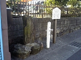 {右}ベルツ花夫人のゆかりの地 道が狭くなり昔の茶屋町を進んで行くと十字路手前の植え込みの中に説明立札がある。江戸時代はこの地に旅籠戸田屋があった。12代目太郎太夫が趣味の飛行機発明に金を使い過ぎ没落したためその長男の熊吉は江戸に出て荒井家の養子になった。元治元年(1864)江戸神田で生まれた熊吉の娘はつは明治9年(1876)政府がドイツから招いた日本近代医学の祖と言われるエルヴィン・フォン・ベルツ博士と明治14年に結婚しベルツ花となり明治38年博士の任期終了とともにドイツに渡った。大正2年(1913)博士が没し大正11年日本に帰国。大正12年には岩屋観音の岩場に鉄の鎖を寄進、昭和5年(1930)には戸田屋に縁のある大寶山西明寺(八幡町寺前7)に博士の供養塔を建立し昭和12年74歳で没した。 |