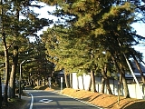 御油ノ松並木 松並木が始まる右には昭和55年「天然記念物 御油ノ松並木」石柱と案内碑、地図英文付き説明板がある。松並木は天正3年(1575)信長の家臣篠岡八右衛門が植樹し慶長9年(1604)家康が大久保長安に命じ整備させたもので当初600本以上あった。枯れたり倒れた際は役人が検分し御林帳(松並木台帳)に記載しており宝暦2年(1752)には498本、文久3年(1863)には276本に減少。昭和19年国天然記念物に指定され終戦直後には200本、昭和30年には167本、昭和34年伊勢湾台風を経て昭和39年には151本に減った。昭和50年に219本の幼木が植えられ昭和58年には日本の名松百選にも選ばれた。平成11年時点で600mに渡り約340本でうち古木70本。現在ある松は1本毎に番号札が付けられている。 |