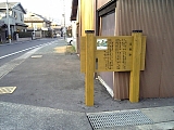 {右}高札場跡 少し先の小さな川の横に茶色の標柱がある。上面には高札を見る庶民の絵が付いている。江戸時代初期に建てられ明治元年(1868)に廃止になった間口と高さ共に2間(3.6m)奥行1間(1.8m)の瓦葺の高札場があった場所。平成19年に復元された高札場が赤坂宿公園にある。現存する正徳元年(1711)に布令された高札板(幅236.5cm)1枚がよらまいかんの裏にある音羽生涯学習会館(赤坂町西裏47-1)2階の資料室に展示されており親孝行の奨励や賭博・喧嘩の禁止などが書かれている。資料館には他にも浮世絵、宿場の説明パネル、音羽赤坂人形の頭部、赤坂の舞台と郷土芸能の紹介、宮路山の紹介、昆虫標本なども展示されている。 |