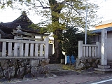 {右}杉森八幡社 赤坂町西縄手3 やがて緩やかな上り坂となり上りきると昭和3年(1928)鳥居と明治44年(1911)豊川市出身の力士・錦戸春吉の名が刻まれた神社名石柱がある。大宝2年(702)持統上皇が東国巡幸の際に伊勢神宮領御厨跡に大神宮を勧請し神鏡を納めたと伝わり八幡社はその時に行在所だった場所に創建された。祭神は天照皇大神、仁徳天皇、應神天皇、神功皇后。寛和2年(986)の棟礼が現存する。大神宮はその後焼失し正徳年間(1711-15)八幡社に合祀された。鳥居をくぐって正面の境内入口にも大正4年(1915)鳥居。社殿左前には2本の楠が成長し根株が一本化した夫婦楠(高さ20m目通6m樹齢千年)と説明板。社殿前の昭和58年の玉垣の外側に天保11年(1840)内側に昭和29年の灯籠。狛犬は大正元年(1912)。 |