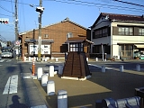 {右}赤坂宿公園 すぐ先の赤坂紅里交差点で右に分岐する道の手前と渡った後の両角にある。角地の民家2軒が空地となったため合わせて200平方mを旧:音羽町が購入し平成19年完成した。交差点手前には復元された高札場、木製常夜燈、宝永8年(1711)赤坂宿町並の図の高札風掲示板があり、渡った所には瓦屋根の四阿、「藤川宿←赤坂宿→御油宿」の石に乗った小さな駕籠モニュメント、赤坂地区の祭事「大名行列」「雨乞いまつり」をカラー写真で紹介した大きな掲示板、座石がある。 |