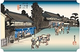 鳴海宿 本陣1脇本陣2旅籠68家数847人口3643[天保14年(1843)] 古くは「遠くなり 近くなるみの 浜千鳥 鳴く音に汐の みちひをぞ知る」と詠まれたように海に近く成海と呼ばれ歌枕の地として多くの歌人に詠まれた。鎌倉時代は鎌倉街道が通り戦国時代は織田と今川の境界で今川は鳴海城を織田は中島砦、善照寺砦、丹下砦を築いた。宿の中心は根古屋町だったが宝暦5年(1755)文化8年(1811)の火事で当時の建物や記録はほとんど焼失。文化8年は「扇屋の火事」と呼び本陣、脇本陣、問屋場も焼失した。現在は道幅のみが往時を偲ばせ名古屋市緑区の中心地となっている。有松絞の有松と同じく鳴海絞を名産とする。天保14年の町並の長さは15町18間(1.6km)。 | |