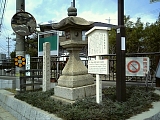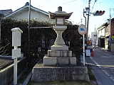 {右}丹下町常夜燈 少し先の居酒屋まる家(鳴海町丹下35-1)の先に秋葉山常夜燈と平成12年設置説明立札がある。寛政4年(1792)鳴海宿の西の入口の丹下町に建てられた。表に「秋葉大権現」左に「新馬中」裏には「願主重因」とある。左には大正15年(1926)建立「子安地蔵大菩薩光明寺」の石柱がある。右折していくと子安地蔵菩薩を本尊とする弘治2年(1556)剛庵和尚開山の一国山光明寺(鳴海町丹下26)があり付近一帯は永享2年(1559)信長が築いた丹下砦跡。桶狭間の戦いの際には水野帯刀らが守将として入城した。東海道はここから少しの間、右に一段高くなった歩道が平行する。 | |