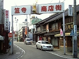 笠寺かんのん商店街 その先の笠覆寺西門前から左折するようにして商店街に入る。玉照姫が商店街のシンボルキャラクターになっている。しばらく進み県道77号線と交差する笠寺西門交差点に出ると左には平成3年建立「笠寺の歴史」案内碑あり下部に笠寺地区の歴史の説明と上部に尾張名所図会の笠寺が金属プレートとなっている。交差点手前右と渡った左には常夜燈をモチーフにしたオブジェもある。交差点横断後も商店街は続きしばらく進むと踏切を渡る。豊橋から東海道と平行し何度も交差した名鉄名古屋本線でこれが最後の交差。線路上から左には本笠寺駅のホームが見える。 大正6年(1917)笠寺駅として開業し昭和18年(1843)国鉄(現:JR)笠寺駅が開業したため本笠寺駅と改称した。踏切を渡ると商店街も終わる。