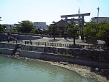 七里の渡し舟着場跡 桑名側 室町時代から栄えていた舟着場は江戸時代には桑名宿の入口で宿の中心だった。明治以降は上流の大垣との物資運搬船の発着場でもあったが鉄道開通などで次第に利用されなくなった。昭和33年県史跡に指定されたが翌年の伊勢湾台風後の防波堤建設などで旧観は大きく変化した。敷地には戦後に七ツ屋から移設した天保4年(1833)常夜燈があるが伊勢湾台風後の修復で上部は別の常夜燈を付け替えたため安政3年(1856)とある。鳥居もあり伊勢神宮の一之鳥居として天明年間(1781-89)に初めて建てられて以降、神宮遷宮ごとに建替えられている。他に数本の松、周辺地図付説明板、敷地外の道路脇には「桑名保勝會」と刻まれた「旧蹟 七里のわたし」石柱、矢印付の「東海道」石柱もある。 |