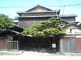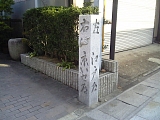 {左}舟会所跡・問屋場跡 舟着場跡から南に向って伸びる道が東海道で少し先の月極駐車場の金網柵前に2つが一緒に説明された説明プレート石柱があるが2つとも実際の明確な位置は不明。舟会所は渡し舟の手続きをし料金を払ったところ。少し先に進むと右から道が交差する路上中央部には平成2年に発見された通り井跡を示す「井」印の石がある。その先左の後藤商店(川口町33)、うどん屋川市(川口町32)、旅館初音(川口町30)が並ぶ付近は標示はないが桑名第ニの本陣である丹羽本陣があった場所で江戸末期の建物は204坪(670平方m)門構玄関付だった。 |
