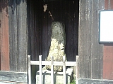 {右}毘沙門堂 京町交差点で県道613号線(京町通り)を渡ると少し先に赤いブロック塀に囲まれた小堂がある。創建時期は不明。寛永12年(1635)から慶安4年(1651)まで藩主だった松平定綱が伝教大師が延暦年間(782-805)に京都の北に毘沙門天を安置して都の守護としたことに習い三重郡菰野町の福王山(標高591m)に移したが再び現在地にも建立された。福王山の中腹にある福王神社(菰野町田口2404)には飛鳥時代に聖徳太子が開基したと伝わる毘沙門堂があり別説としてこれが定綱が移した堂とも伝わっている。江戸時代には福王山は桑名藩領で藩の御用林があり山番所に山代官が置かれ保護されたため現在も杉の大木が多く残り国有林となっている。山麓の原野は藩主の狩場でもあった。 |