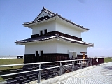 {左}蟠龍櫓(水門統合管理所) 舟着場跡の川下側にある2層入母屋造の白壁の建物で入口に説明板がある。広重の桑名宿の絵にも描かれている蟠龍櫓(ばんりゅうやぐら)を推定復元し平成15年に建てられた。桑名城の隅櫓の1つである蟠龍櫓は幅6間(11m)奥行4間(7.3m)と大きな方で屋根上には蟠龍をかたどった瓦があり元禄14年(1701)天守閣焼失以降は51あった櫓の中でも代表的な建物だった。蟠龍とは天に昇る前のうずくまった状態の龍(臥龍)のことで文化3年(1806)刊の「絵本名物時雨蛤」に「臥龍の瓦は当御城門乾櫓上にあり、この瓦名作にして龍影水にうつる。」とある。建物の2階は展望室兼資料室となっており蟠龍瓦のレプリカ、桑名城の城下地図、浮世絵、歴史等も展示されている。9:30-15:00、月休、無料。 |