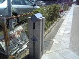 {左}通り井跡 少し進むと説明プレート石柱がある。石柱前の路上には「井」の字を刻んだ小さな石がはめ込まれている。桑名は揖斐川や地下水にも海水が混じり生活用水に利用できないため寛永3年(1626)道の下に埋めた筒に西の町屋川から引いた水が通された。道の中央に井戸のように正方形の木升で水を汲む場所を作り利用したため「通り井」と呼ばれ木升は大名行列の際には通行に支障をきたすため外され蓋が置かれたと言う。元禄年間(1688-1703)には宿内に15ヵ所あったとされいくつかは明治に入っても使われていた。昭和37年(1962)にこの場所での工事中に木升跡が発見され位置を示すため「井」石がはめ込まれた。平成2年には舟会所跡の近くでも工事中に発見され同じく「井」石がはめ込まれている。 |