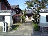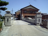 {右}四宝山 教宗寺 [浄土真宗本願寺派] 新町35 右折しばらく行くとある。明応2年(1493)法盛寺の末寺として創建され戦後現在地に移された。本尊は阿弥陀如来。境内には本堂、庫裏、明治19年(1886)手水石のみで本堂は愛知県海部郡八開村(現:愛西市)から移築したもの。明治9年に光明寺や法盛寺で始まった浄土真宗本願寺派の僧侶養成学校である五瀬教校は後にこの地に教室、講堂、寄宿舎などが建てられ明治33年(1900)には三重仏教中学校となった。明治35年に彦根の金亀仏教中学校へ吸収合併され第三仏教中学校となり後に京都に移り現在は龍谷大学付属平安中学校・高等学校となっている。ここの跡地には明治37年から同じく本願寺派の九華育児院が設置されていた。 |