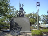 {左・寄}本多忠勝像(桑名城三之丸跡) 柿安本社ビル向かいの駐車場前にある。平成2年建立で立坂神社が所蔵する昭和41年市指定文化財の紙本淡彩本多忠勝画像を元に中川梵鐘が製作した。忠勝は慶長6年(1601)初代桑名藩主となると城の整備のほか城下町にも「慶長の町割」と呼ばれる大整備をした。付近は桑名城三之丸跡で駐車場奥の吉之丸コミュニティパーク(吉之丸7)は平成元年に造られた芝生広場で同年建立の伊勢湾台風30年碑、高潮堤防緊急嵩上事業竣工之碑もある。三之丸には藩主の居住する御殿もあったが明治初期に取壊され対面所と伝わる建物は浄泉坊の書院として移築された。三之丸跡には明治29年(1896)桑名紡績工場も建てられ明治40年三重紡績、大正3年(1914)東洋紡績となったが空襲で破壊された。 |