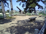 {左・寄}辰巳櫓跡 本丸跡右の堀沿い奥の小高いところ。本丸東南(辰巳)角にあった3重櫓で天守閣焼失後はその代わりでもあり慶応4年(1868)降伏の印とし焼き払われた。幕末の藩主松平定敬は実兄の会津藩主松平容保と共に幕府側の主要人物であったため維新後、城は徹底して破壊された。現在は大砲、ベンチが置かれている。手前の本丸西南の小高いところは神戸櫓跡で文禄年間(1592-96)城主・一柳直盛が移した伊勢神戸城(現:鈴鹿市)天守閣が残され江戸時代に櫓となったもの。現在はベンチがあるのみ。他に本丸跡には昭和51年建立桑名出身の水谷一楓歌碑、昭和17年「三重県指定史蹟桑名城跡」碑、明治23年(1890)森陳明忠魂碑「精忠苦節碑」。本丸跡奥は朝日丸跡で野球場(九華公園グランド)がある。 |