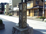 {右}春日神社鳥居 柿安本店前の横断歩道のない交差点を渡り少し行くとある。慶長7年(1602)初代桑名藩主本多忠勝によって奉納された木造の鳥居が大風により倒壊したため寛文7年(1667)藩主松平定重によって再建された。青銅製で町内の鋳物師の辻内善右衛門種次が造り慶長金で250両かかったと言う。高さ6.9m柱周57.5cm。「勢州桑名に過ぎたるものは銅の鳥居に二朱の女郎」と謡われた鳥居でその威容を誇っていたが幾度も災害で破損。その度に現在の辻内鋳物鉄工(西別所40)である辻内家が修復してきた。昭和34年(1959)伊勢湾台風でも高潮により打上げられた荷物船が衝突し倒壊した。翌年修復されたが衝突傷は鳥居の柱部分に今も残りその説明文も柱に刻まれている。昭和40年指定県文化財。 |
