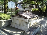 {右・寄}春日神社 御膳水井 社殿前左にある。江戸中期より神供用として用いられていた井戸で明治元年(1868)9月25日明治天皇が桑名に滞在した際には水質の良いこの井戸水が御膳水として使われた。後に一般開放されたが昭和20年戦災で埋没し後に復元された。昭和47年指定市文化財。境内左には昭和40年建立山口誓子句碑「山車統べて 鎧皇后 立ち給ふ」、平成10年建立二川のぼる句碑「山車の燈に 夜は紅顔の 皇后よ」がある。境内左奥には境内社の母山神社があり参道右にはさざれ石がある。岐阜県の天然記念物にも指定されている伊吹山麓特産の石灰質角礫岩で国歌に歌われている石として昭和36年に小林宗一が発見し全国の神社などに奉納されておりここにある石も子孫により平成2年寄進されたもの。 |