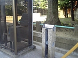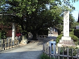 {右}しるべ石 鳥居の左にある。明治18年(1885)建立で正面に「志類べ以志」と刻まれ左面に「たづぬるかた」右面に「おしゆるかた」と刻まれており倒壊を防ぐため鉄枠で補強されている。しるべ石は「迷い児石」とも呼ばれ人の集まる場所に建てて迷子や行方不明の人を捜すための掲示板の代わりをした。「たづぬるかた」面に尋ね人の特徴を書いた紙を貼ると心当たりのある人が「おしゆるかた」面へその旨を記した紙を貼った。上部の凹んだ部分が紙を貼るスペース。古くは人の集まる所には多く設置されていたが現在も残っているものは少ない。 |