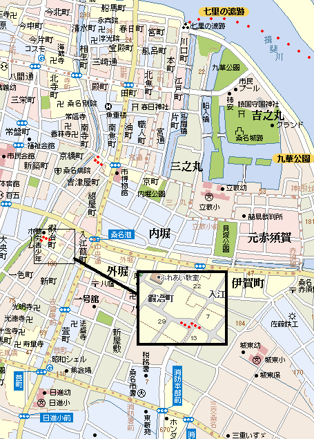 七ツ屋枡形跡 貝増商店前を過ぎて左折し少し行くと道路が少し左にふくらむようになっている。ここは江戸時代には左にずれる小さな枡形になっておりその先で東海道は堀を七ツ屋橋で渡っていた。現在は堀も橋もなく橋手前左にあった天保4年(1833)常夜燈も戦後に七里の渡し舟着場跡に移された。吉津屋門から東海道の左側も堀となっており平成12年にはここの左の民家敷地奥から堀の石垣の基礎部分も発見された。東海道は七ツ屋橋を渡って右折しており現在はおもちゃ屋いもや本店(新町99)がある角がその曲がり角で矢印付き「東海道」石柱もある。右折後は寺や神社が並ぶ寺町通りとなり本多忠勝が慶長の町割を行った際に寺院が集められた。 |