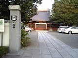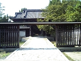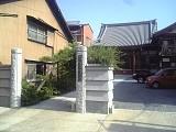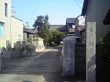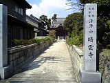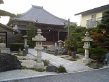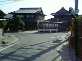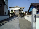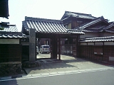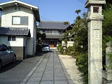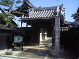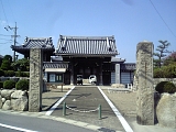 {左}桑部山 了順寺 [浄土真宗本願寺派] 大福222 少し進むと蛤の形をした生姜風味の焼菓子「七里焼き」(1個126円)を売る戦後創業のつたや(大福180-2)が右にありその少し先に立派な構えの寺がある。永録11年(1568)信長に敗れた桑部城の守将・毛利氏の子孫・毛利秀久が出家し恵秀と称し元和7年(1621)創建した。山門は桑名城の城門を明治初期に移築したと伝わり本堂は明治35年(1902)12世恵霖の時の建立で戦災も免れた。山門入って左の鐘楼は重層で袴付き。鐘楼と本堂の間の墓地には文化8年(1811)没の桑名の俳句結社「間遠社(まとうしゃ)」3世春亭裏鏡の円筒形の墓がある。横に力士で文政6年(1823)に没した浪の音吉右衛門、安政4年(1857)に没した浪の音吉蔵の墓もある。 |